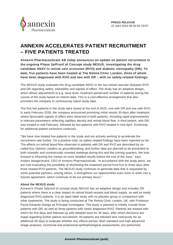 "We have now treated five patients in the study and are actively working to accelerate the recruitment rate further. On a positive note, no safety-related findings have been reported so far. The effects on retinal blood flow observed in patients with DR and RVO are described by so-called Key Opinion Leaders as groundbreaking, and further data are planned to be presented at both scientific and commercially oriented meetings during this and the coming quarters. We look forward to informing the market on more detailed results before the end of the June," says Anders Haegerstrand, CEO of Annexin Pharmaceuticals. "In accordance with the study plans, we are now evaluating the possibility of shortening the treatment period from five to three days after three treated RVO patients. The NEXUS study continues to generate data that is requested by some potential partners, among others. It strengthens our opportunities even more to enter into a license agreement, which continues to be our primary focus."