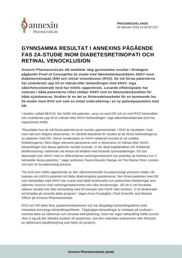 Annexin Pharmaceuticals AB meddelar idag gynnsamma resultat i företagets pågående Proof of Concept/fas 2a studie med läkemedelskandidaten ANXV inom diabetesretinopati (DR) och retinal venocklusion (RVO). De två första patienterna har utvärderats upp till en månad efter behandlingen med ANXV. Inga säkerhetsrelaterade fynd har hittills rapporterats. Lovande effektsignaler har noterats i båda patienterna vilket stödjer ANXV som en läkemedelskandidat för båda sjukdomarna. Studien är en del av förberedelsearbetet för en kommande fas 2b-studie inom RVO och som en initial undersökning i en ny patientpopulation med DR.